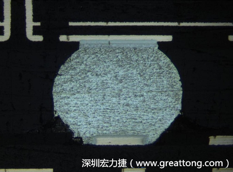 通常拿到一张BGA的切片照片时,第一个要判断的就是那一边属于BGA的封装面,那一边又是属于电路板组装面。对于这个问题,我的方法是从铜箔的厚度来做判断,铜箔比较厚的那一面通常是电路板组装面,因为BGA封装的载板通常都比电子组装的电路板来得薄,所以会选用比较薄的铜箔厚度。